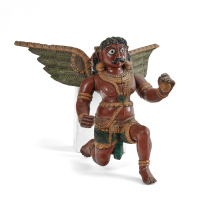 Legno intagliato e dipinto, la divinità alata raffigurata stante su plinto.