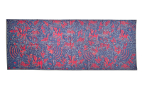 Nei toni del blu e del rosso, decoro di animali e arabeschi stilizzati.