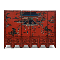 Sei ante, legno laccato e dipinto, sul davanti composizione con figure femminili nel paesaggio con padiglioni, rocce e alberi, il retro con fiori e oggetti benaugurali.