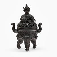 Bronzo, il contenitore sostenuto da tra piedi a forma di testa di elefanti, sul corpo arabeschi floreali a rilievo e anse a testa di elefante con proboscide curva verso l'alto, il coperchio con decoro