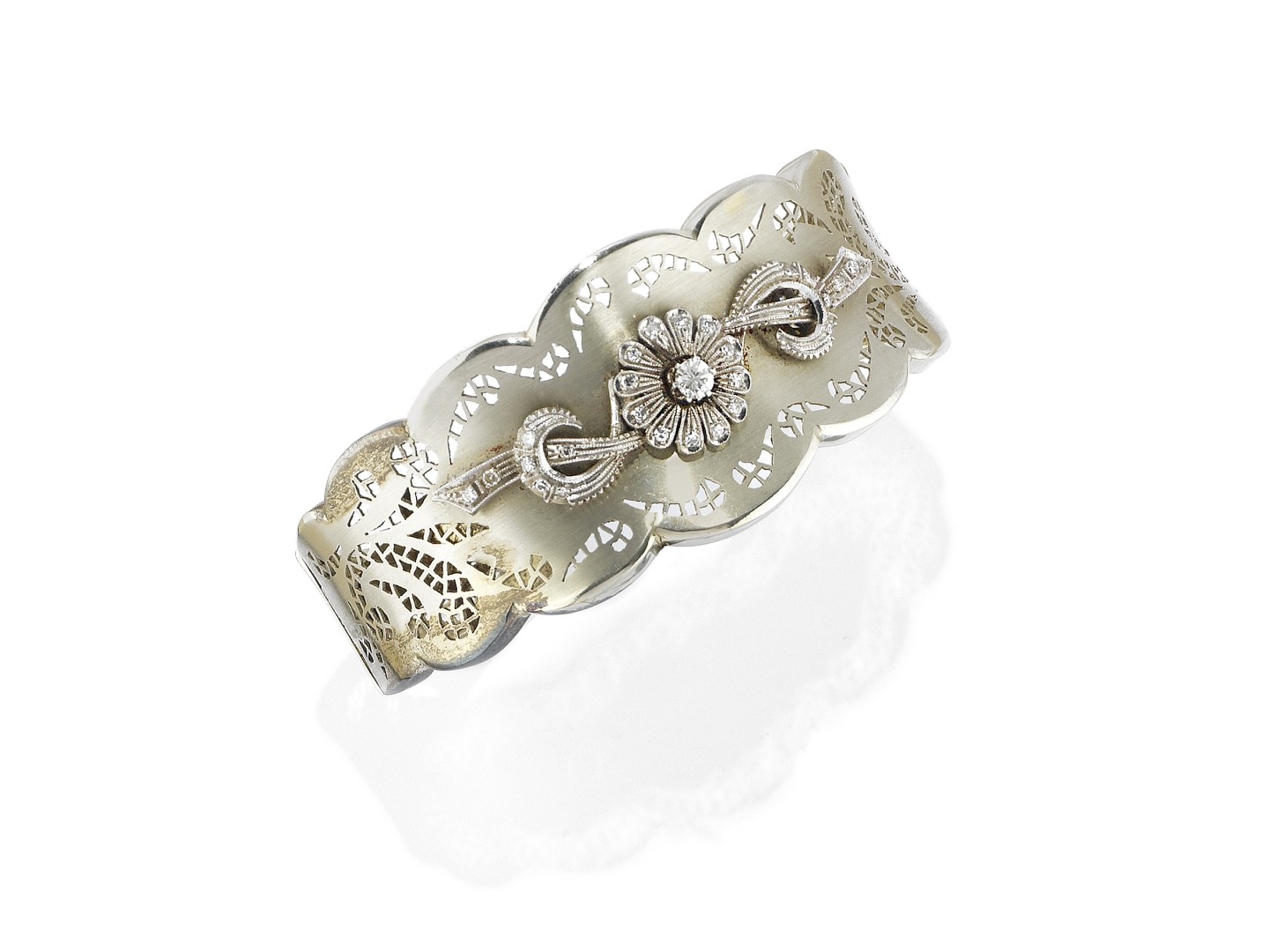 Asta gioielli: Gioiello di Cartier. Questa dicitura implica che a nostro parere l’oggetto è, per firme, caratteristiche, punzoni, attribuibile alla maison indicata. Resta inteso che ogni rappresentazione scritta o verbale fornita da Aste Bolaffi, incluse quelle contenute nel catalogo, in relazioni, commenti o valutazioni concernenti qualsiasi carattere di un lotto, quale paternità, autenticità, provenienza, attribuzione, origine, data, età, periodo, origine culturale ovvero fonte, la sua qualità, ivi compreso il prezzo o il valore, riflettono esclusivamente valutazioni in buona fede di Aste Bolaffi e possono essere riviste e modificate in qualsiasi momento da Aste Bolaffi. L’acquirente quindi non può fare quindi alcun affidamento su tali rappresentazioni.