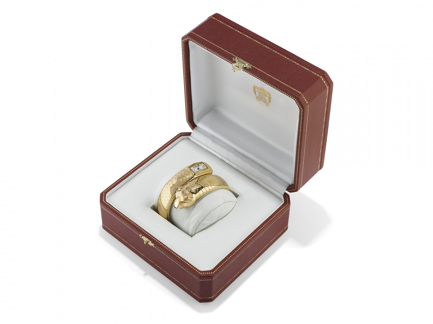 Asta gioielli: Gioiello di Cartier. Questa dicitura implica che a nostro parere l’oggetto è, per firme, caratteristiche, punzoni, attribuibile alla maison indicata. Resta inteso che ogni rappresentazione scritta o verbale fornita da Aste Bolaffi, incluse quelle contenute nel catalogo, in relazioni, commenti o valutazioni concernenti qualsiasi carattere di un lotto, quale paternità, autenticità, provenienza, attribuzione, origine, data, età, periodo, origine culturale ovvero fonte, la sua qualità, ivi compreso il prezzo o il valore, riflettono esclusivamente valutazioni in buona fede di Aste Bolaffi e possono essere riviste e modificate in qualsiasi momento da Aste Bolaffi. L’acquirente quindi non può fare quindi alcun affidamento su tali rappresentazioni.