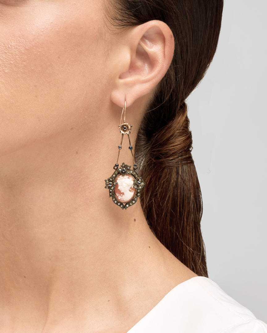 in argento e oro con cammeo centrale con contorno di diamanti taglio rosa e zaffiri. Italia XI secolo.