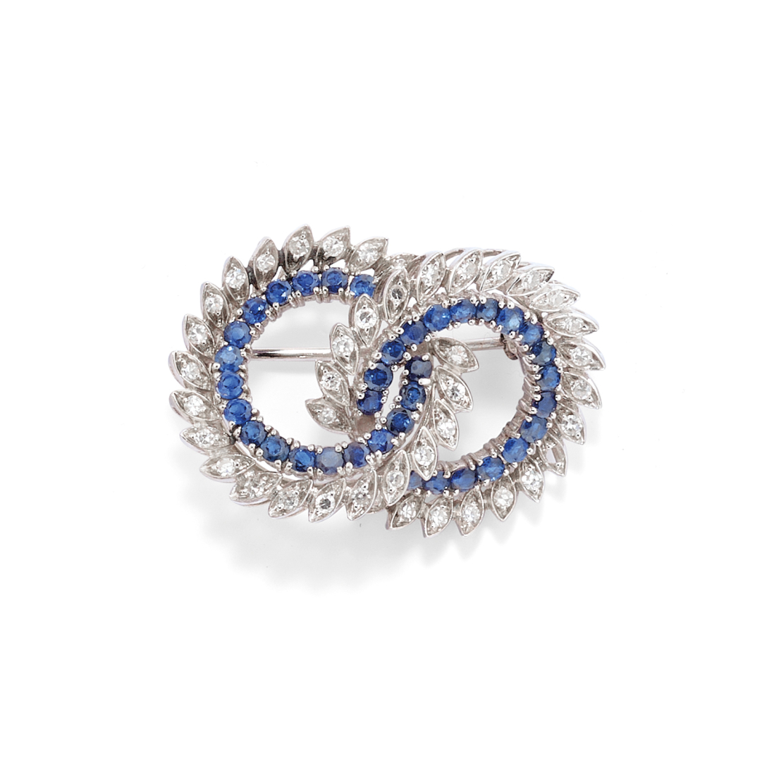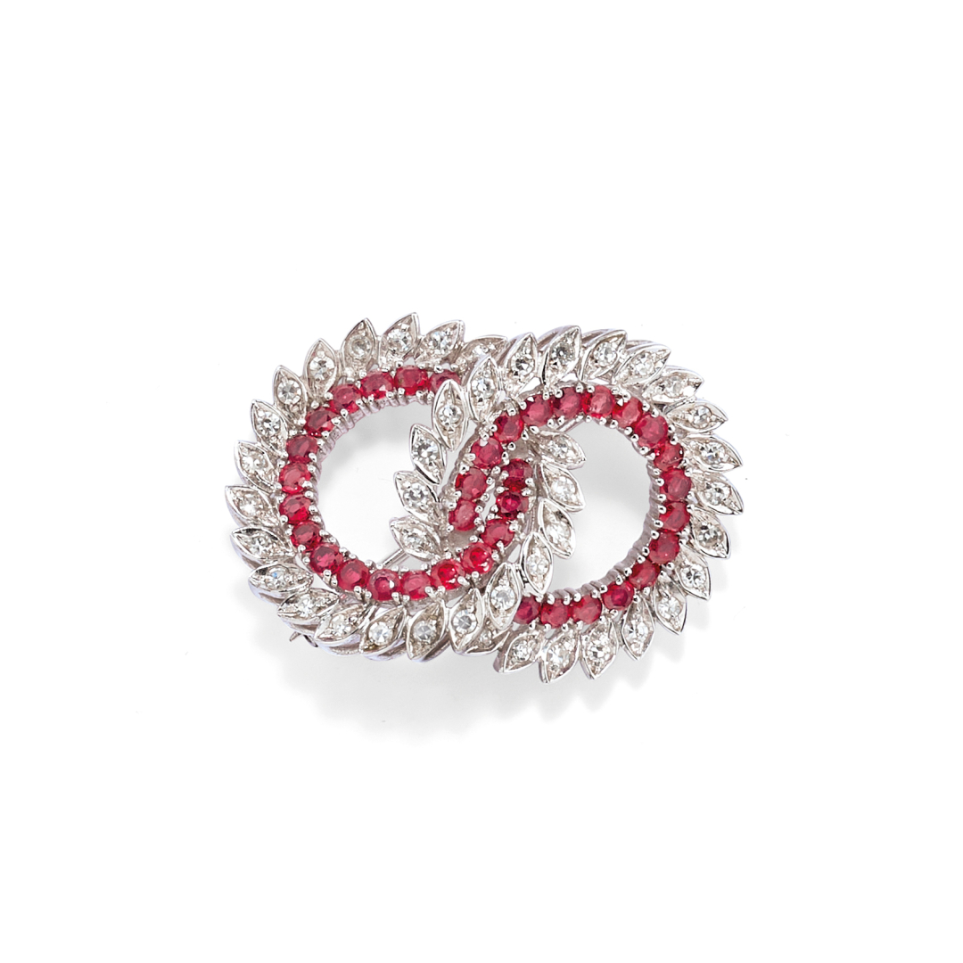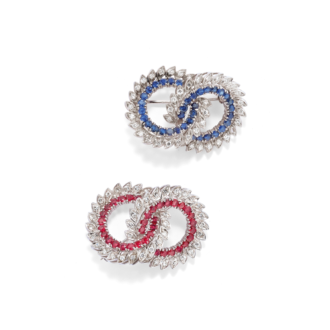 in oro bianco e realizzate mediante due cerchi intersecanti con foglie in diamanti taglio huit-huit per ct 1,00 ca. e un filo interno di corindoni per complessivi ct 3,00 ca. Manca un diamante.