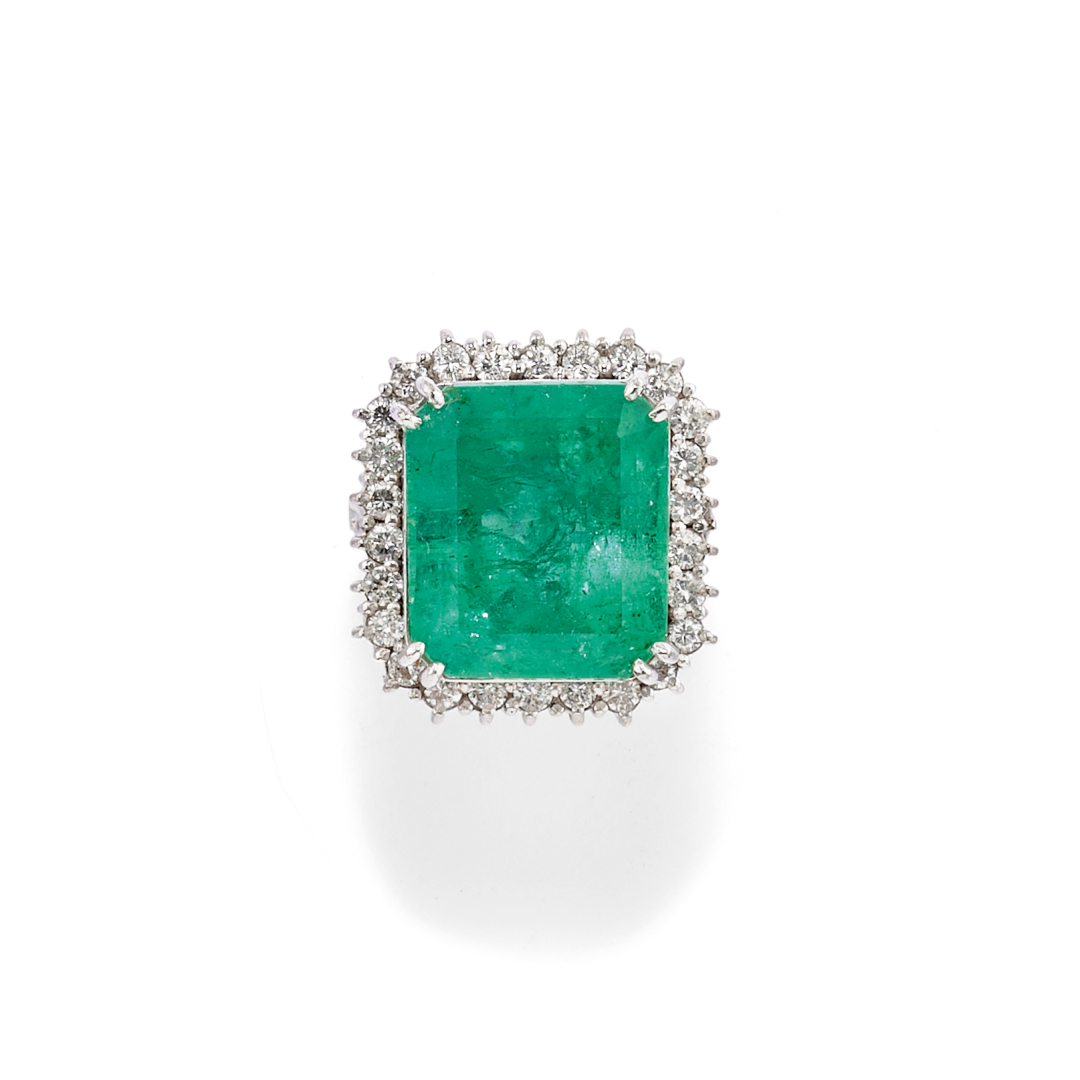 in oro bianco e smeraldo taglio rettangolare a gradini per complessivi ct. 22,00 ca. circondato da una fila di diamanti rotondi per complessivi ct 1,00 ca.