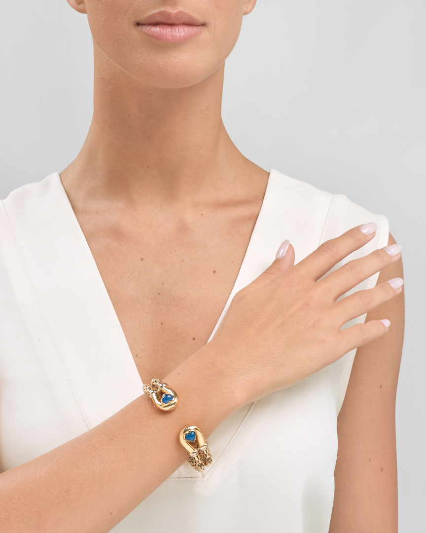 giallo e bianco realizzato a manetta rigida con due cavi vuoti lavorati e terminanti a U con due cuori in pietra blu.