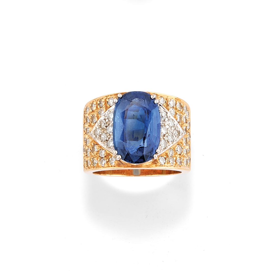 in oro giallo e bianco a fascia con zaffiro taglio ovale di ct 5 ca. contornato ai lati da pavè di diamanti taglio huit-huit.