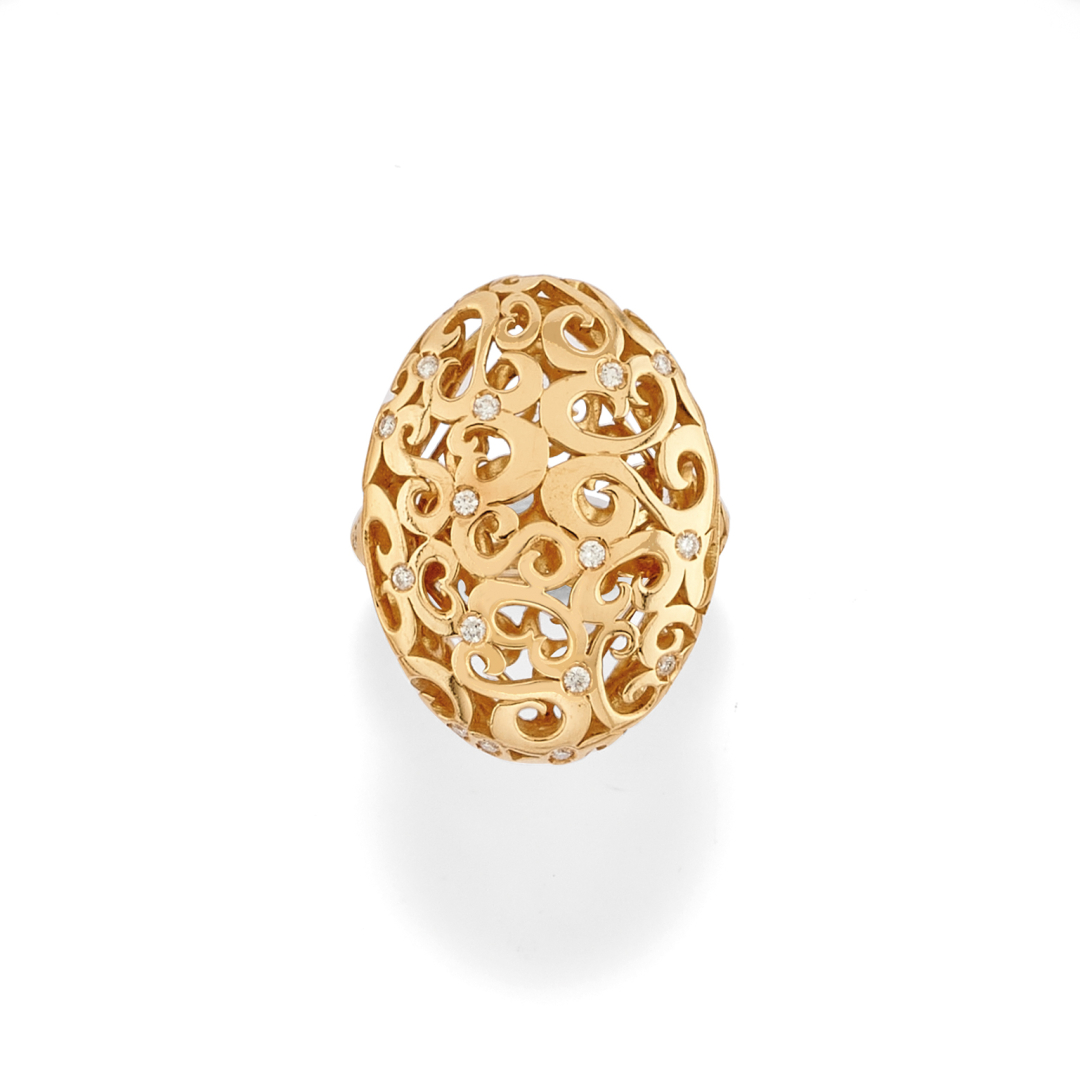 realizzato in forma ovale bombata con diamantini presenti all'interno di volute arabeggianti.