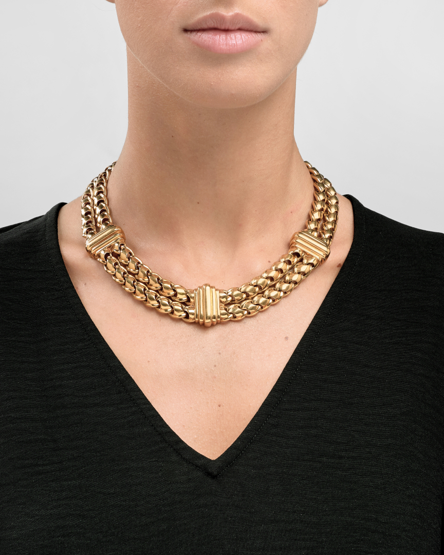 eseguito con lavorazione di due maglie concatenate legate insieme da tre piastre scanalate digradanti.