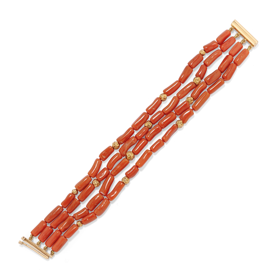 a quattro fili in corallo mediterraneo a motivo bambù, intervallati da sferette d'oro, con chiusura in oro.