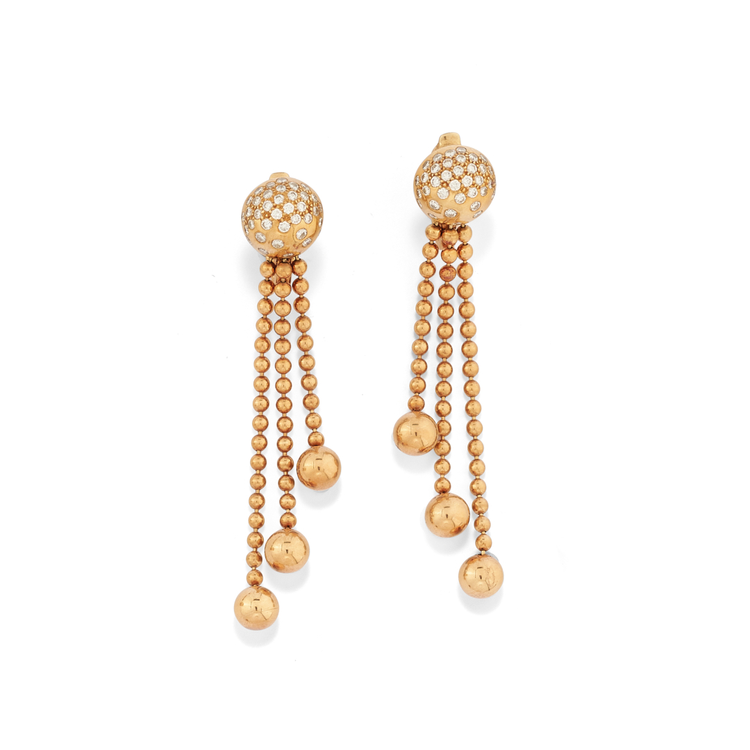con sfera in oro giallo e diamanti taglio brillante rotondo da cui pendono catene a sfere. Firmati Cartier e numerati.
