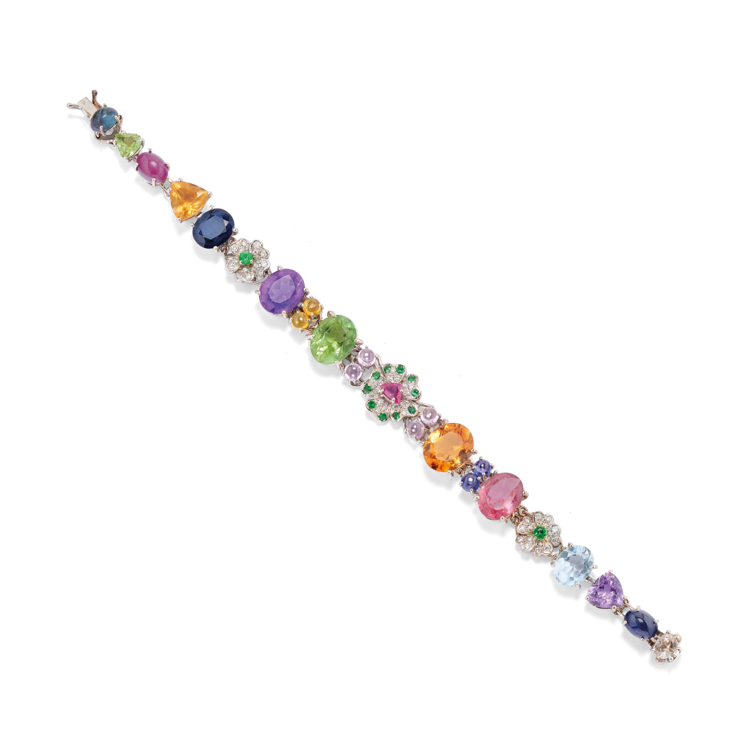 Realizzato oro giallo con rubino taglio cuore di ct. 0,55 ca., rubino taglio cabochon di ct 2,30 ca., zaffiro taglio ovale di ct. 2,54 ca e zaffiri di vari tagli per complessivi ct. 4,00 ca., citrino taglio tricorno e taglio cabochon per complessivi ct. 3,14 ca., tormalina taglio a cuore e taglio cabochon per complessivi ct 11,50 ca., ametista e topazio con fiori laterali in diamanti per complessivi ct. 0,40 ca. e smeraldi per complessivi ct. 1,00 ca.