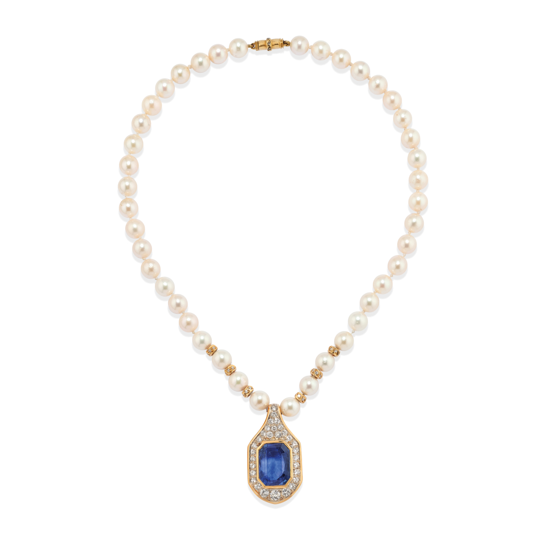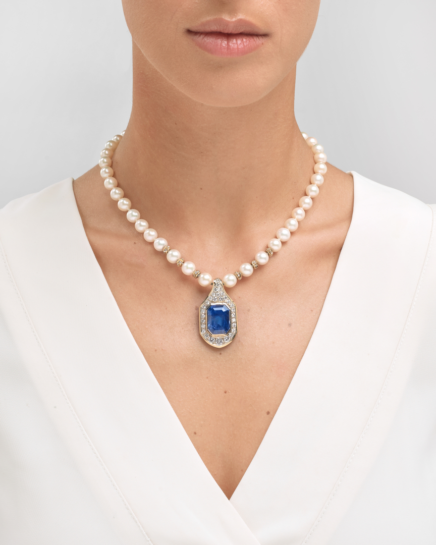 in perle coltivate di mm 7,00 circa che sorreggono un ciondolo in oro giallo e diamanti di ct 2,00 ca e con al centro uno zaffiro naturale di taglio rettangolare a gradini di ct 19,00 ca. Certificato CISGEM Milano.