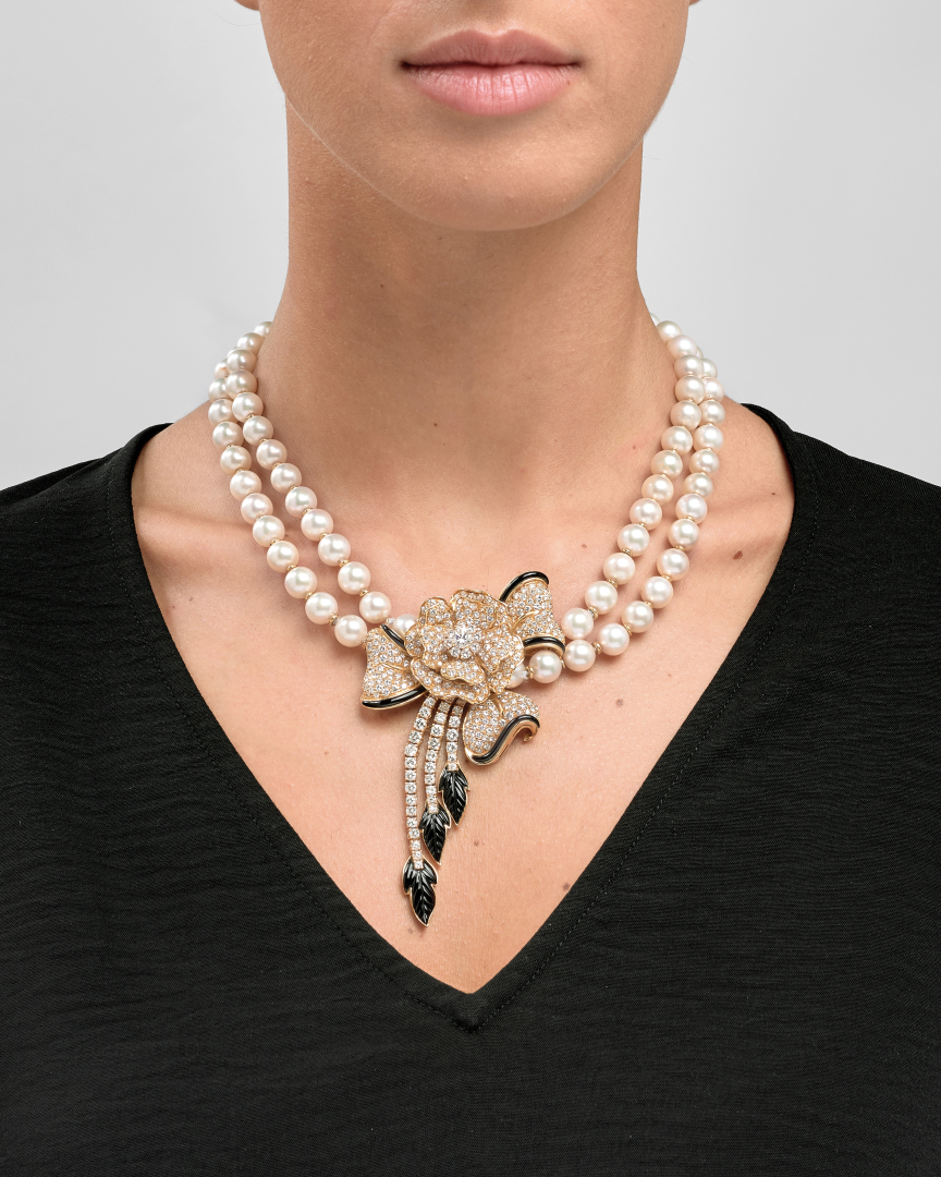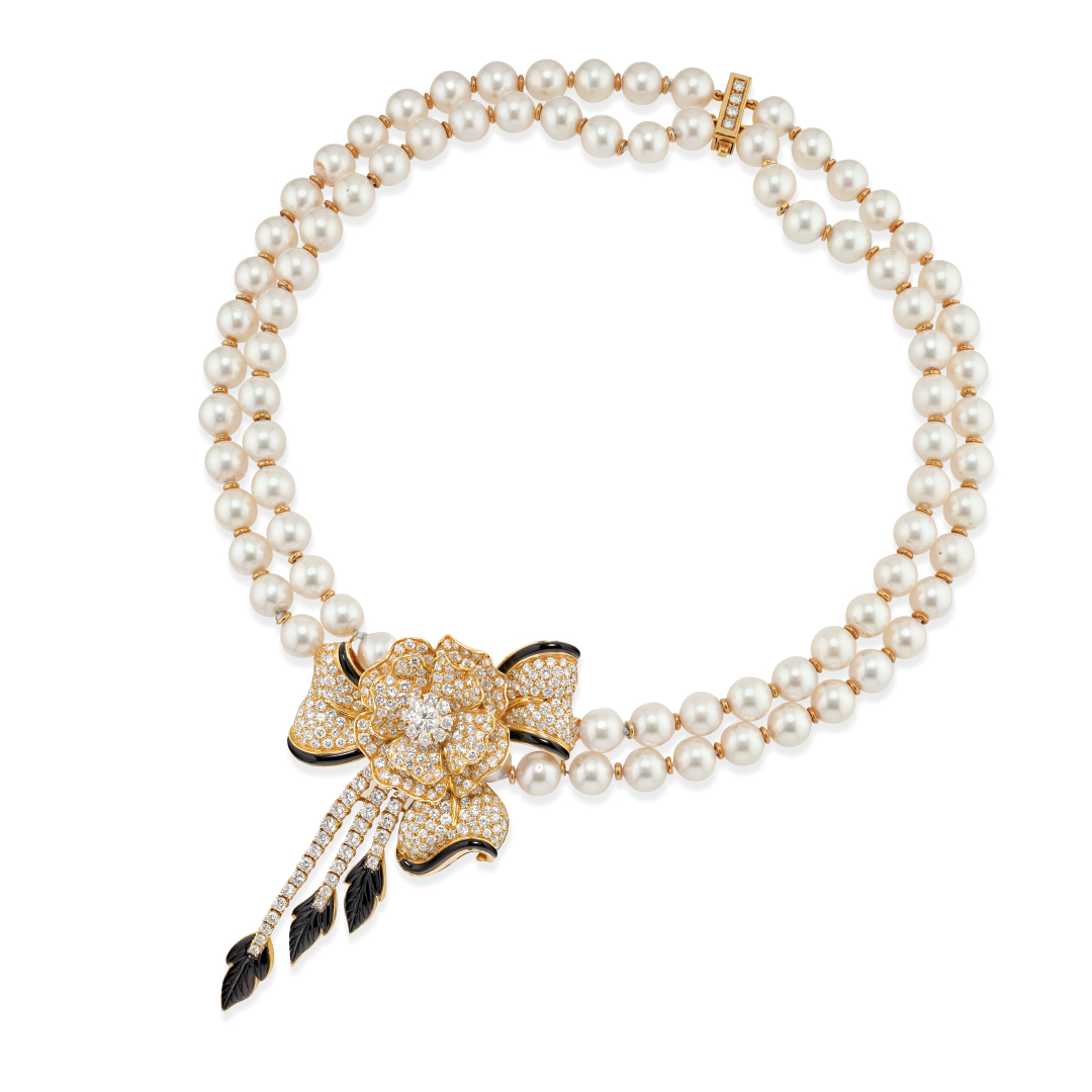 in oro giallo a due fili di perle di mm 8,50 intramezzate da tondini d’oro e terminante con un grande pendente a fiocco e motivo floreale con diamanti per complessivi ct 6,50 ca. e onice.