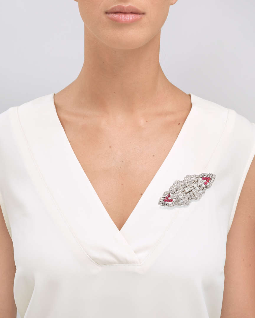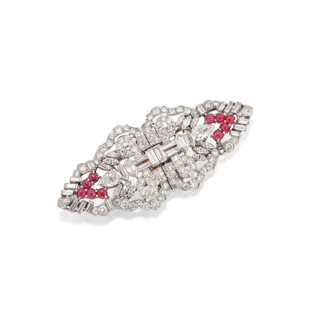 in oro bianco di forma romboidale con diamanti vari tagli per complessivi ct 11,50 ca e ct 3,00 ca di rubini cabochon. Circa 1940.