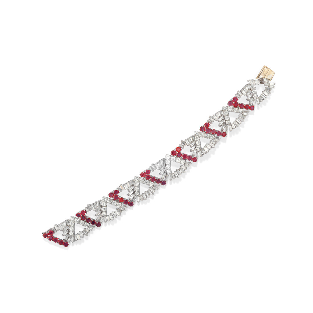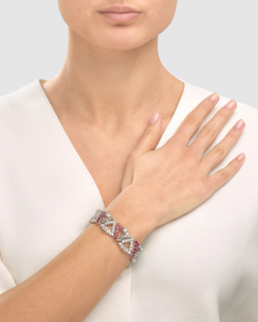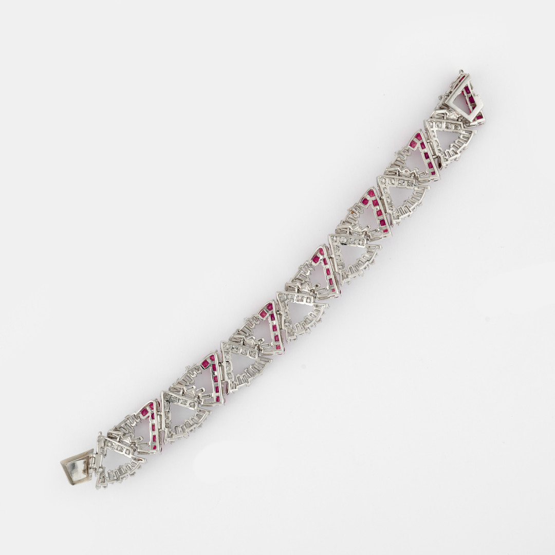 in platino a maglie snodate triangolari che alternano diamanti taglio baguette e brillante a rubini rotondi e diamanti taglio baguette. Peso delle baguette ct 9,75, peso dei diamanti taglio brillante ct 5,61 e dei rubini birmani ct 8,30. Punzone di Frascarolo. Circa 1965.