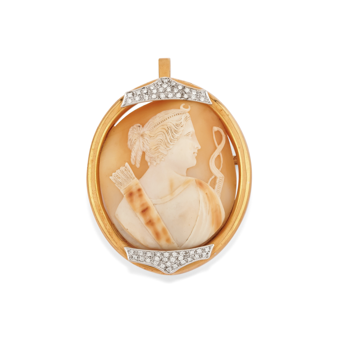 cammeo ovale in conchiglia montato su oro giallo che raffigura una donna con arco e faretra.
