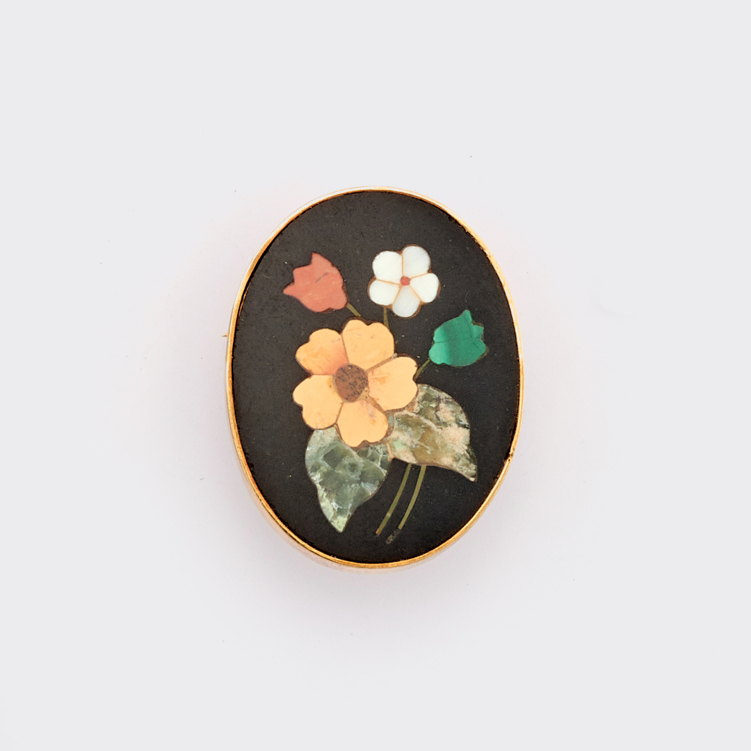 in oro giallo e realizzata a mosaico fiorentino a motivo floreale eseguito su pietra nera (onice) e intarsi policromi di pietra dura.