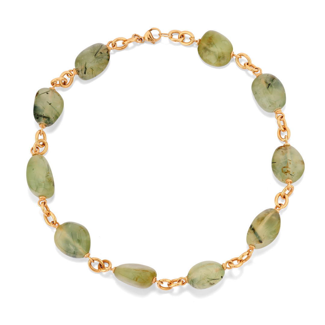 in oro giallo con ciottoli di frenite verde naturale intervallata da maglie di oro giallo.
