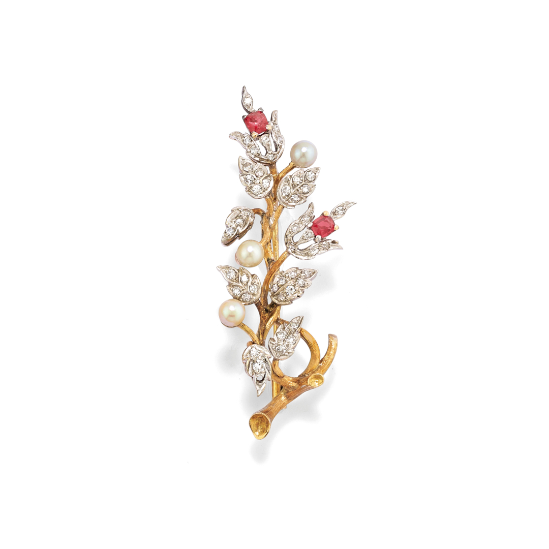 bianco, giallo e rosso eseguita con foglie di diamanti taglio huit-huit, perle e due corindoni.