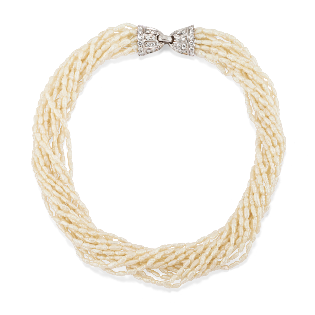 formata da torchon di undici fili di perle d' acqua dolce con chiusura in oro bianco e diamanti in due parti tenuta insieme da un gancio.