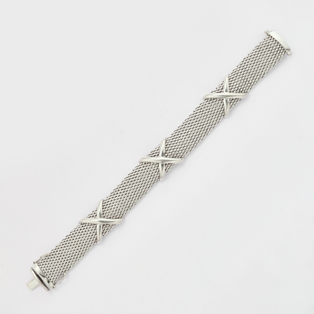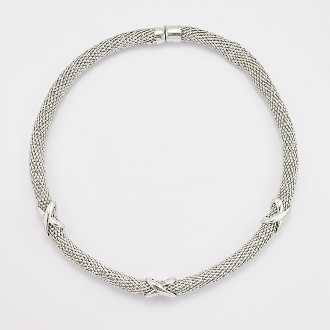 composta da collana e braccialetto realizzati ad elementi puntinati o a pelle di serpente con motivi a croce e a croce tonda sovrapposte. La collana presenta dei difetti.