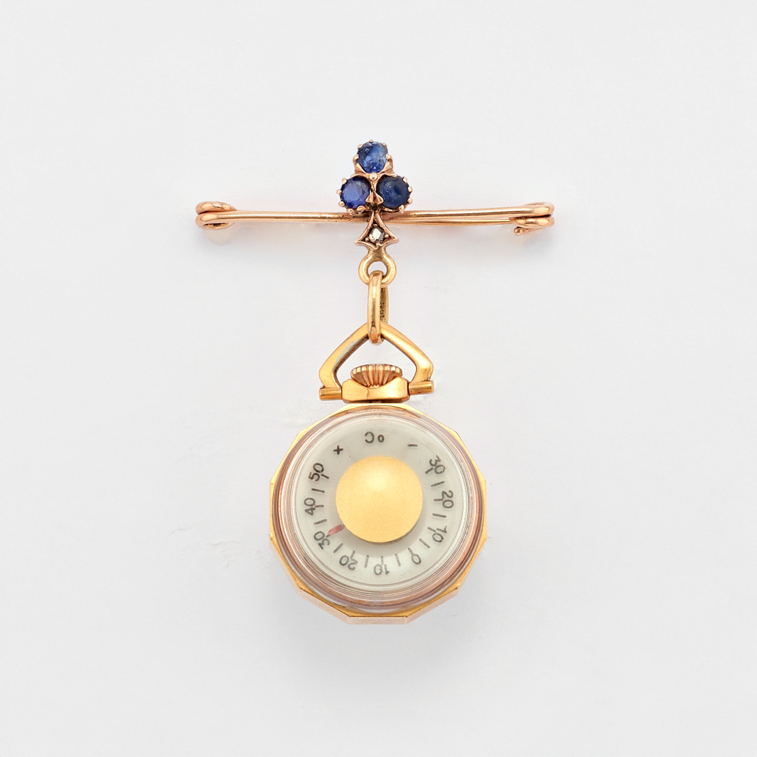 in oro giallo, zaffiri e diamante che sorregge un orologio/termometro da esterno racchiusi in un'unica sfera di materiale trasparente double face bordata da una lamina dorata a elementi rettangolari.
