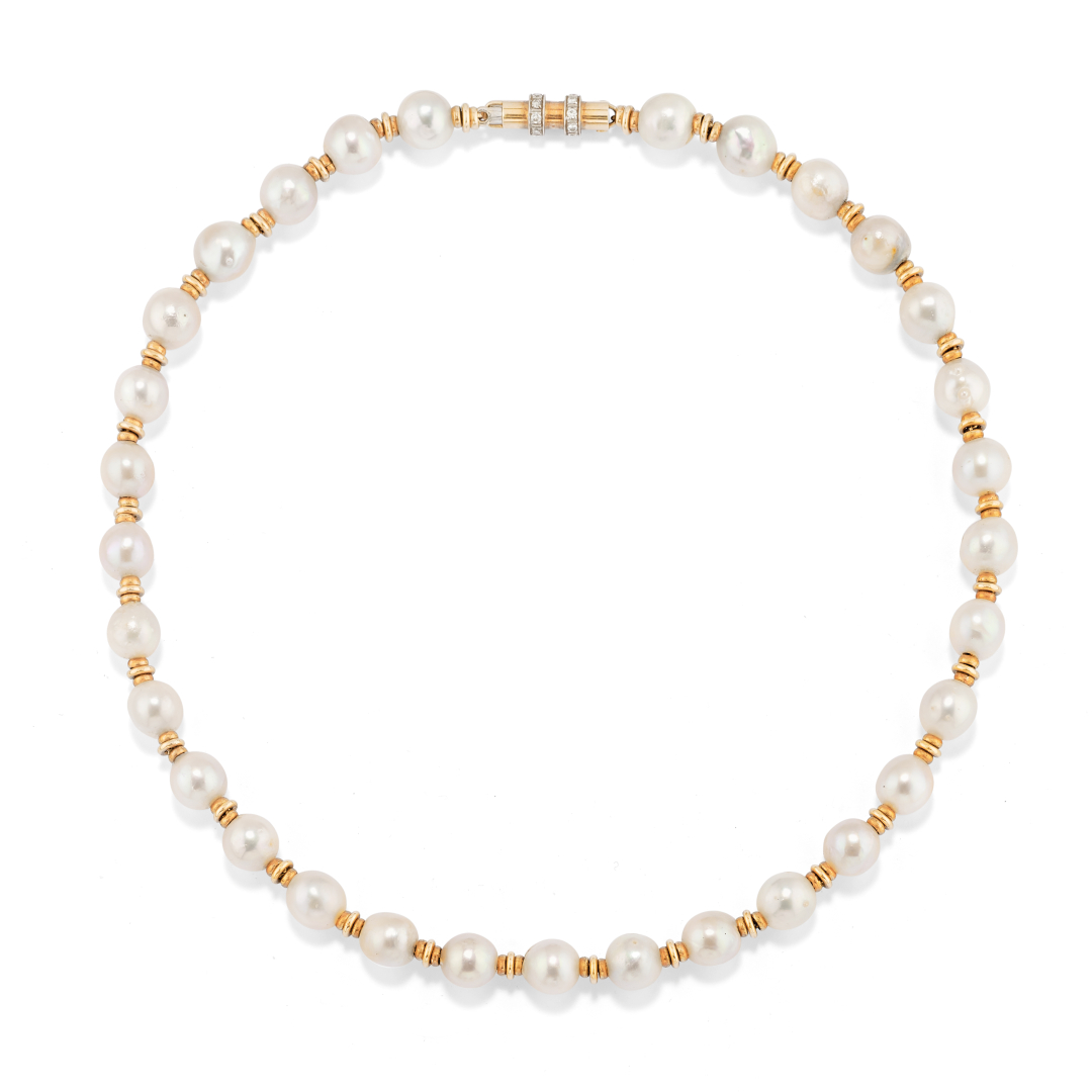 di mm 8,00 ca. intervallate da tondini d'oro con chiusura a barilotto in oro e due cerchi di diamanti.