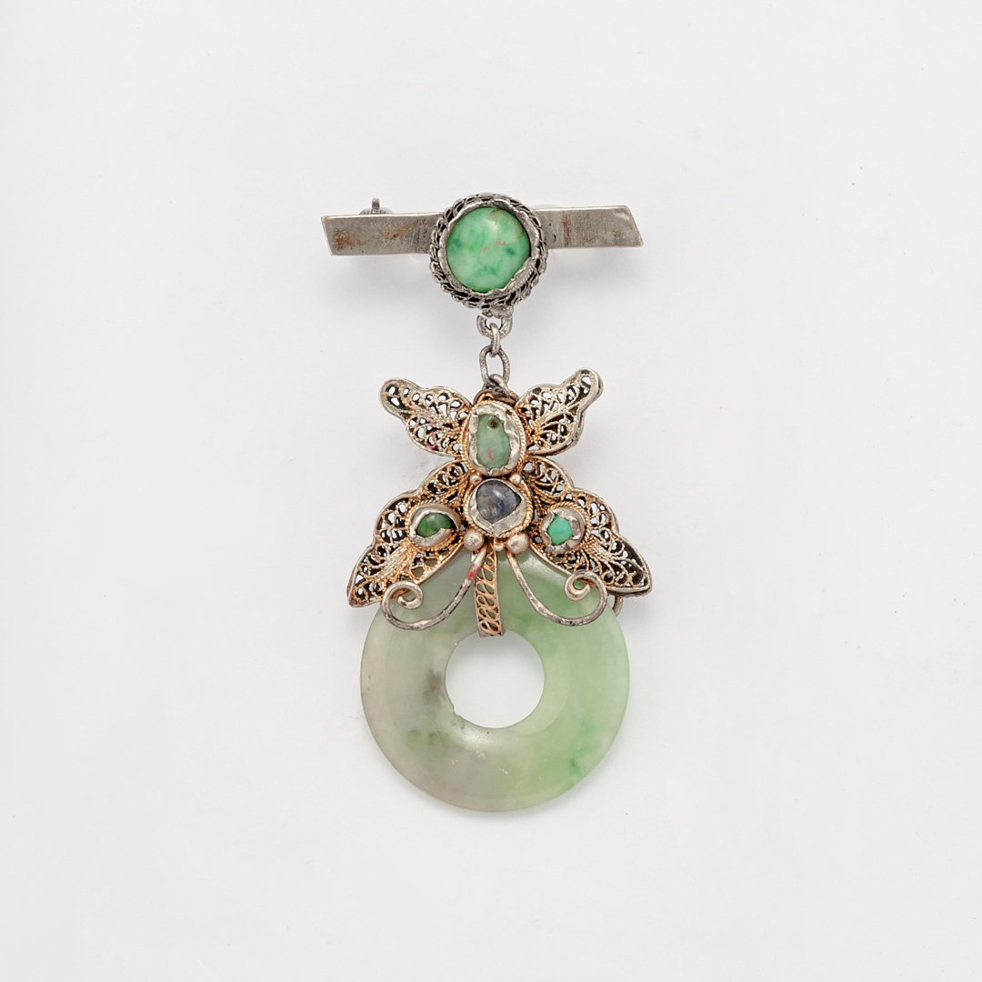 in oro e in argento e composta da una spilla che sorregge un pendente composto da un cerchio di giada e cabochon di giade e zaffiro.