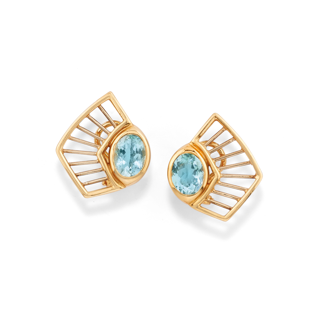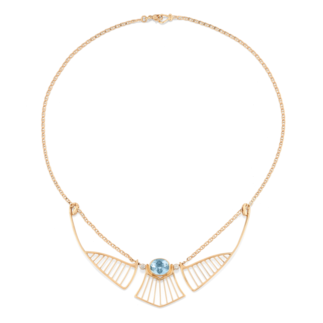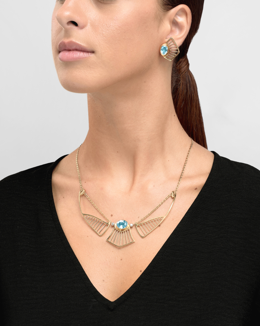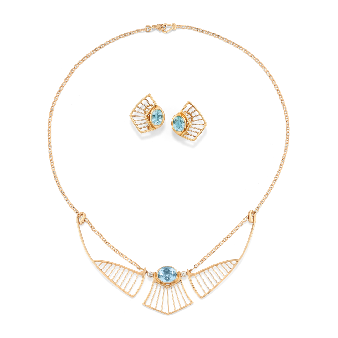 in oro giallo a motivo geometrico composta da una collana con topazio e diamanti laterali e un paio di orecchini a clip, con ct. 9,00 circa di topazi azzurri in totale.
