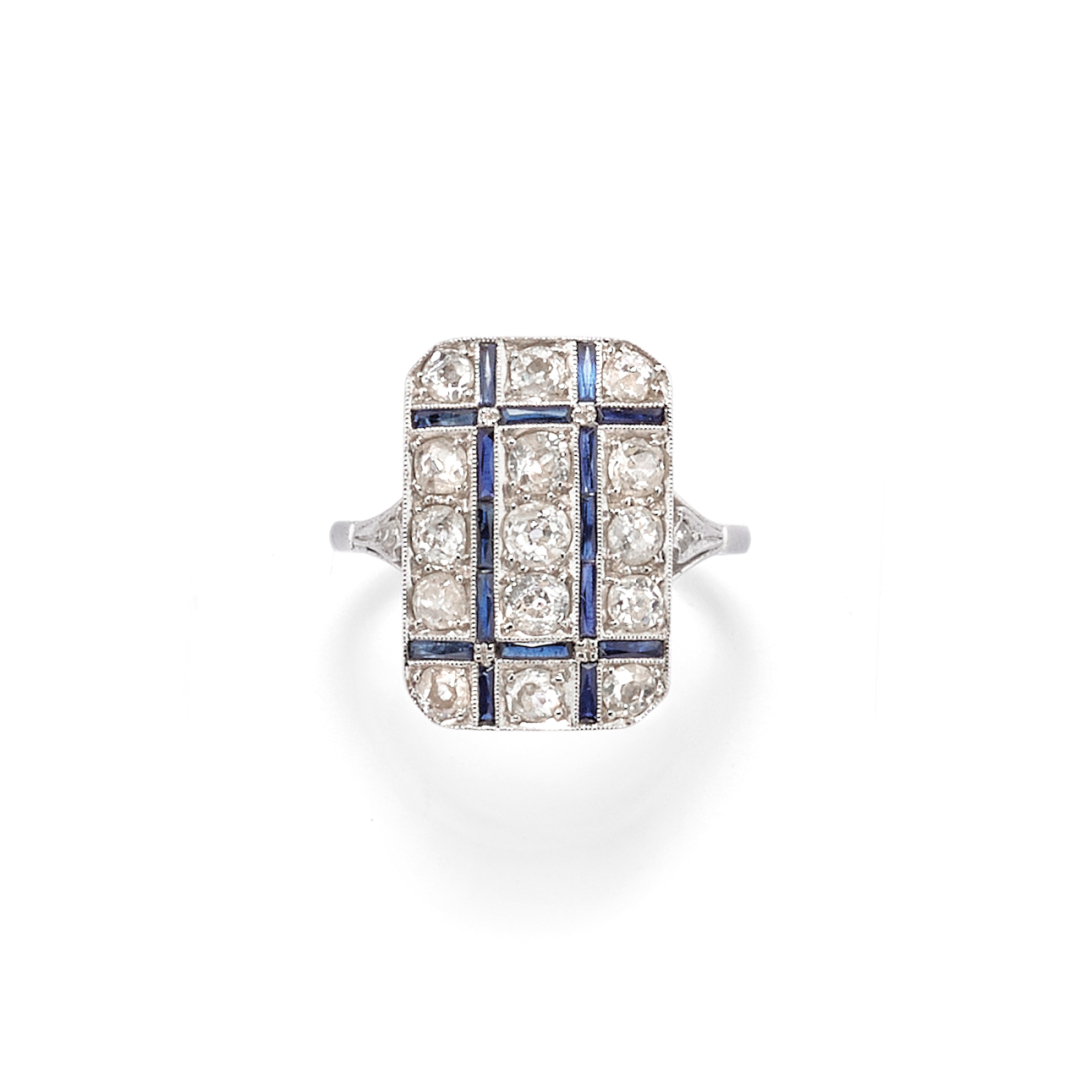 in oro bianco con tavola a sviluppo rettangolare e tre file di diamanti taglio Vecchia Miniera, intervallati da reticoli di zaffiri. Circa 1940.