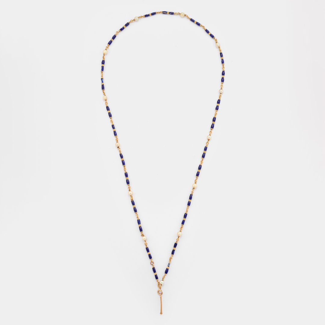eseguita in oro giallo a maglie tonde intervallate da barilotti di smalto blu e perle.