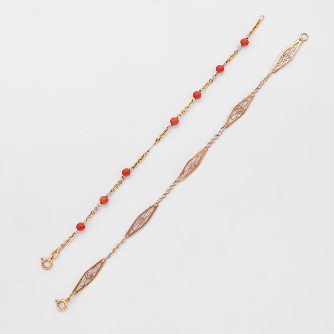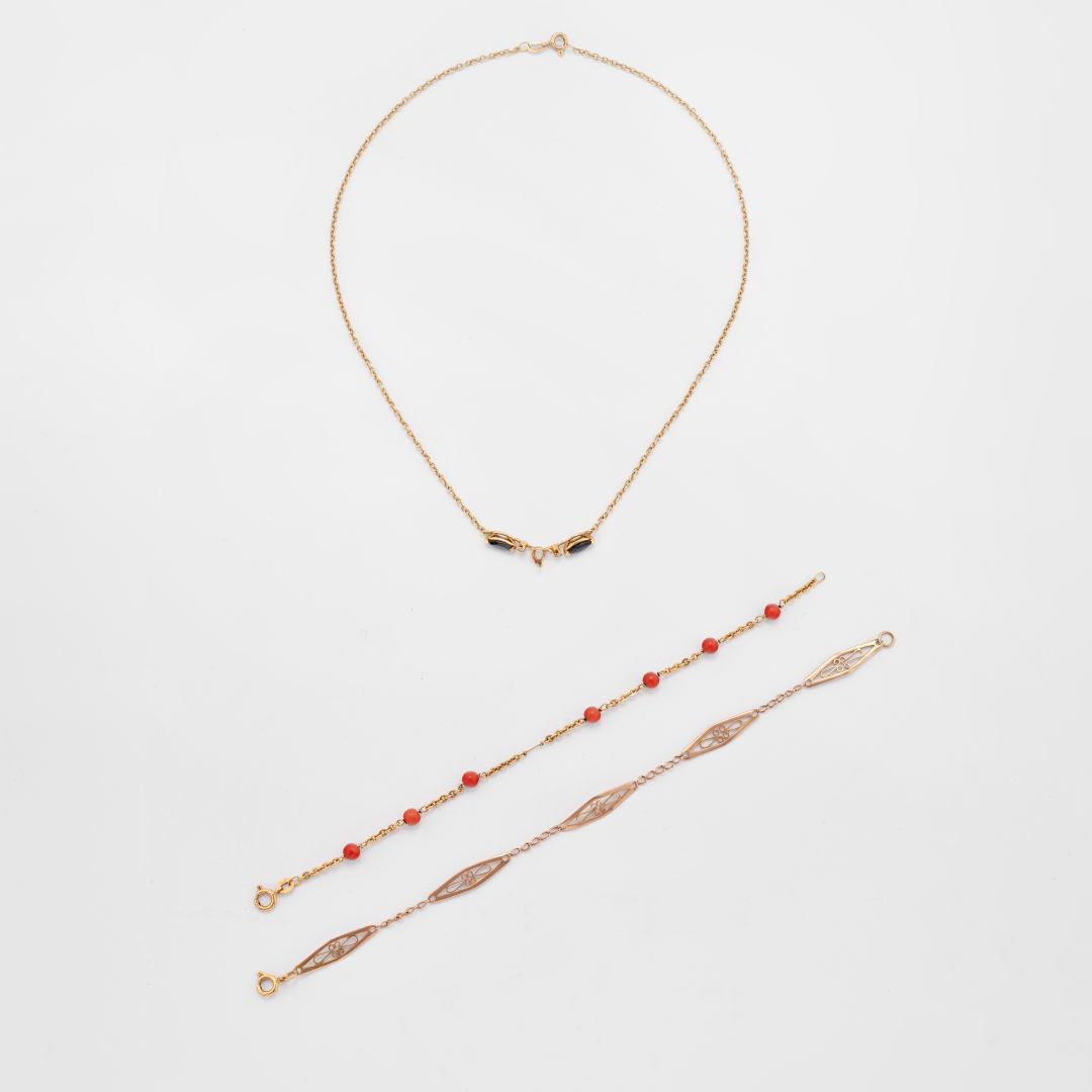 composto da una collana con zaffiri e diamanti e un bracciale con sfere di corallo in oro giallo e un bracciale realizzato a maglia a ventaglio in oro giallo 9 kt. Difetti.