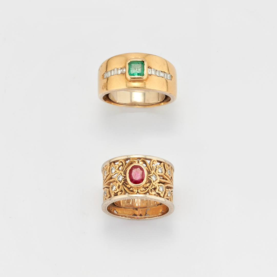 uno eseguito a fascia in oro giallo e smeraldo ed uno a fede lavorata in oro bianco e giallo con rubino centrale.