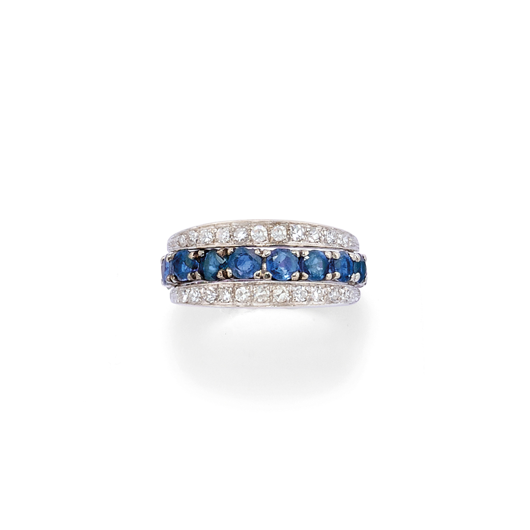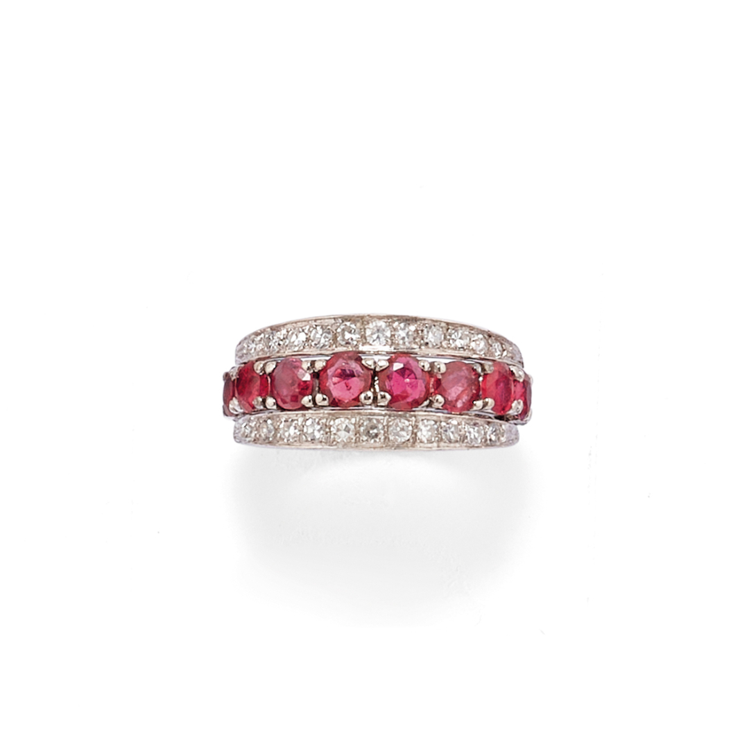 in oro bianco, composta da due giri di diamanti che affiancano sia la fila di rubini che quella di zaffiri per complessivi ct 2,00 ca.