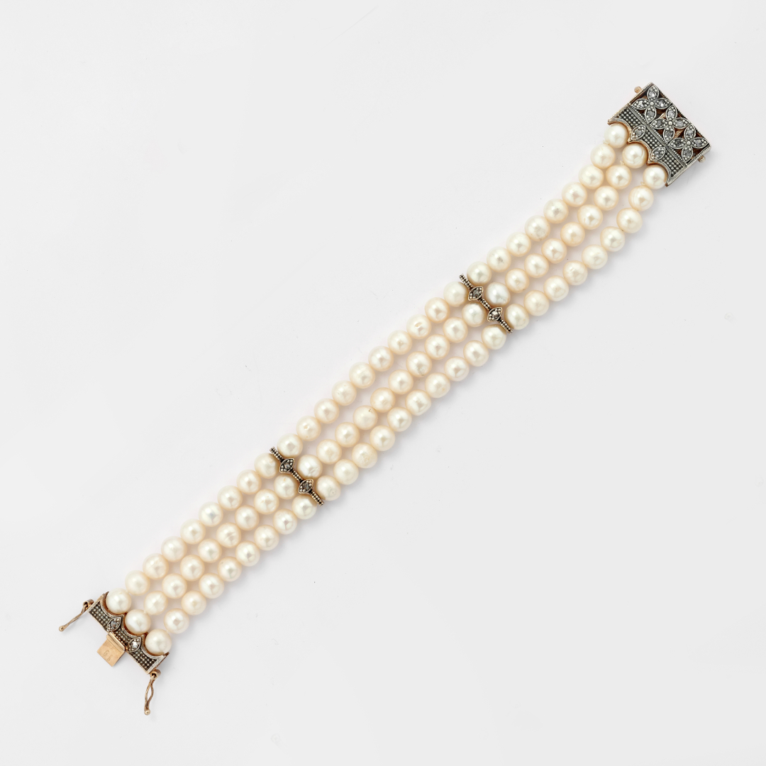 in argento dorato a tre fili di perle e pietre trasparenti a motivo floreale.