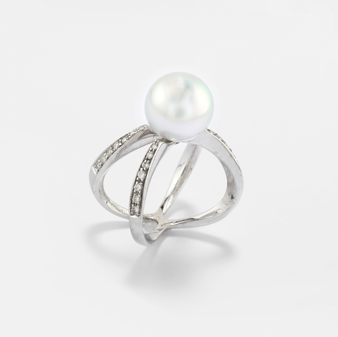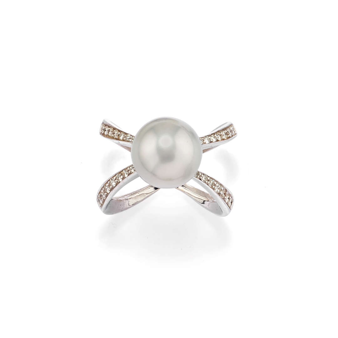 in oro bianco con montatura incrociata con diamanti taglio brillante e perla di mm 12,00.