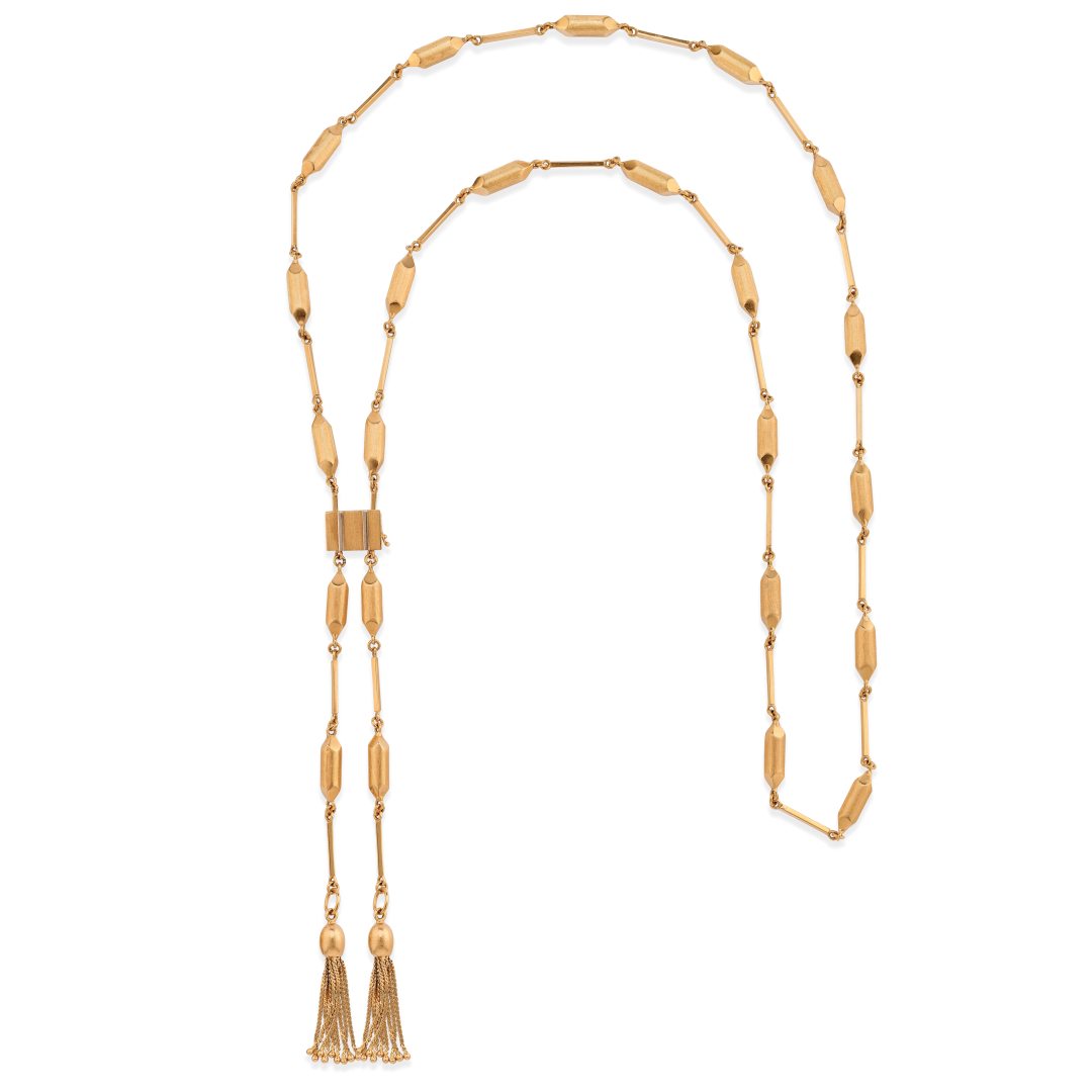 formata da una lunga catena a prismi pieni rastremati, tenuti insieme da elementi a segmenti lisci e terminante con due frange, trattenuti da un saliscendi di forma rettangolare.