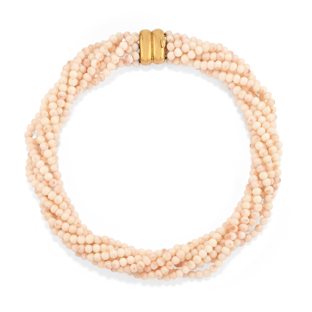 Composto da girocollo a sette fili di sferette di corallo rosa e bracciale a sei fili. Entrambi con chiusure in oro giallo.