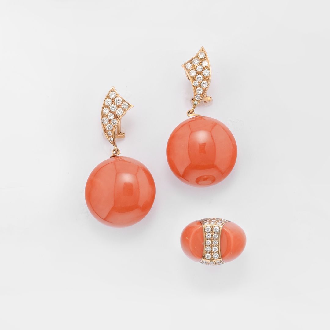 in oro giallo composta da un paio di orecchini a clip con grandi bottoni di corallo lucido e diamanti e da un anello a fascia in corallo e intarsio centrale di diamanti.