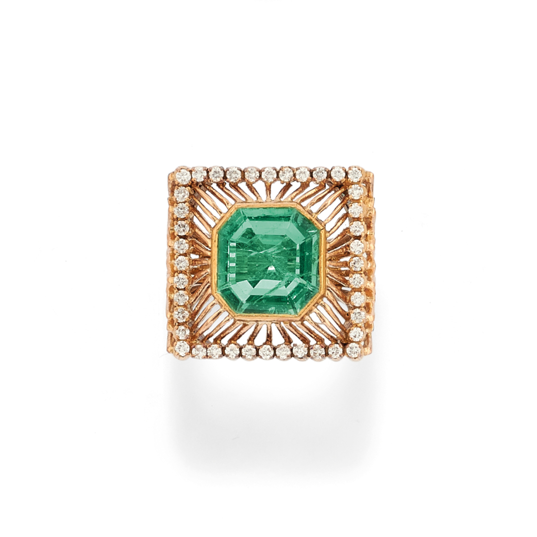 a base quadrata in argento ed oro giallo, con diamanti tondi per complessivi ct 0,40 ca e smeraldo ottagonale centrale per complessivi ct. 4,00 ca. 1940.