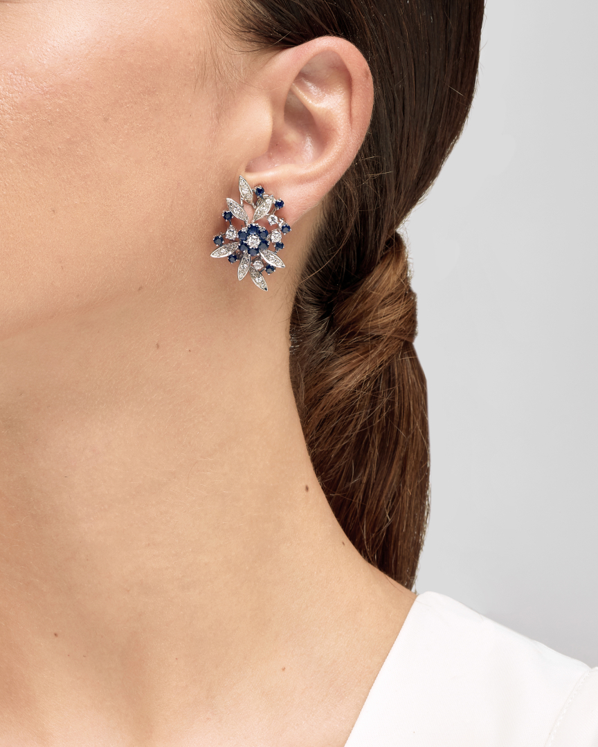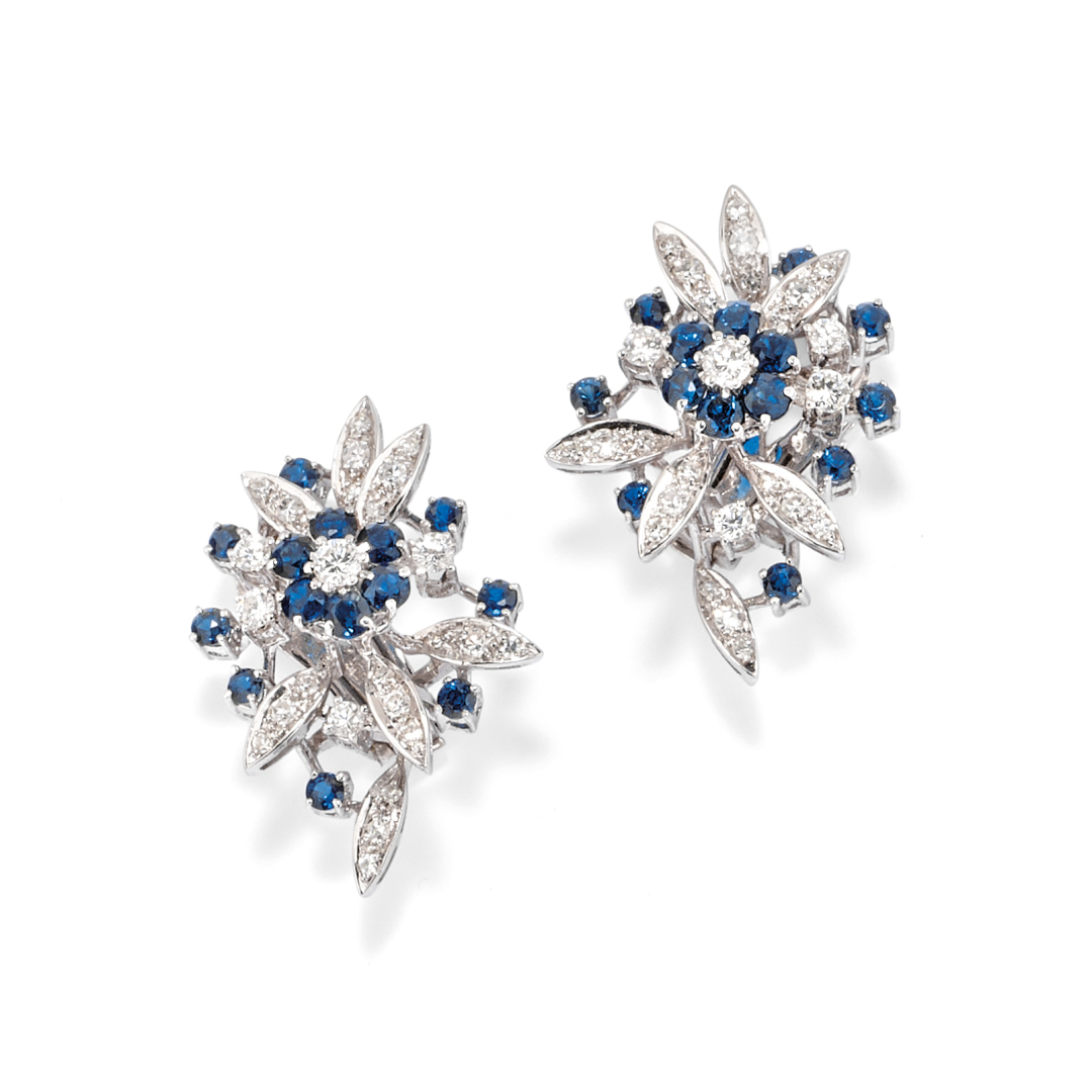 a motivo floreale in oro bianco e diamanti taglio rotondo brillante e taglio huit-huit sulle foglie, abbelliti da zaffiri blu.