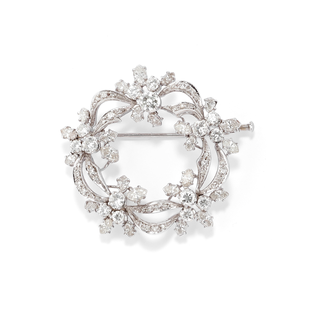 in oro bianco a motivo floreale composta da cinque fiori in diamanti di tagli diversi per complessivi ct. 2,50 ca.
