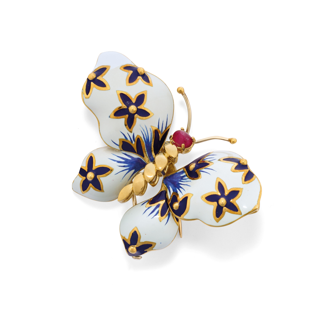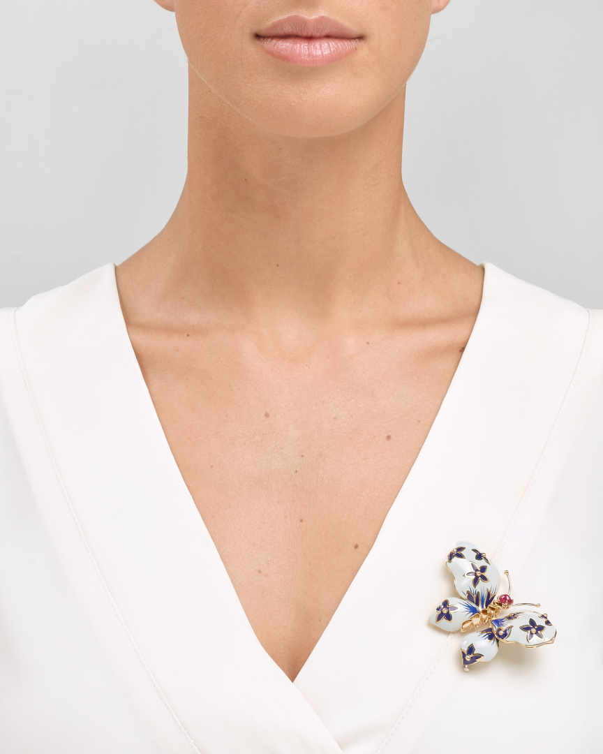 raffigurante una farfalla in oro giallo, con smalti e con rubino cabochon come testa. Restauro allo smalto sull'ala sinistra.