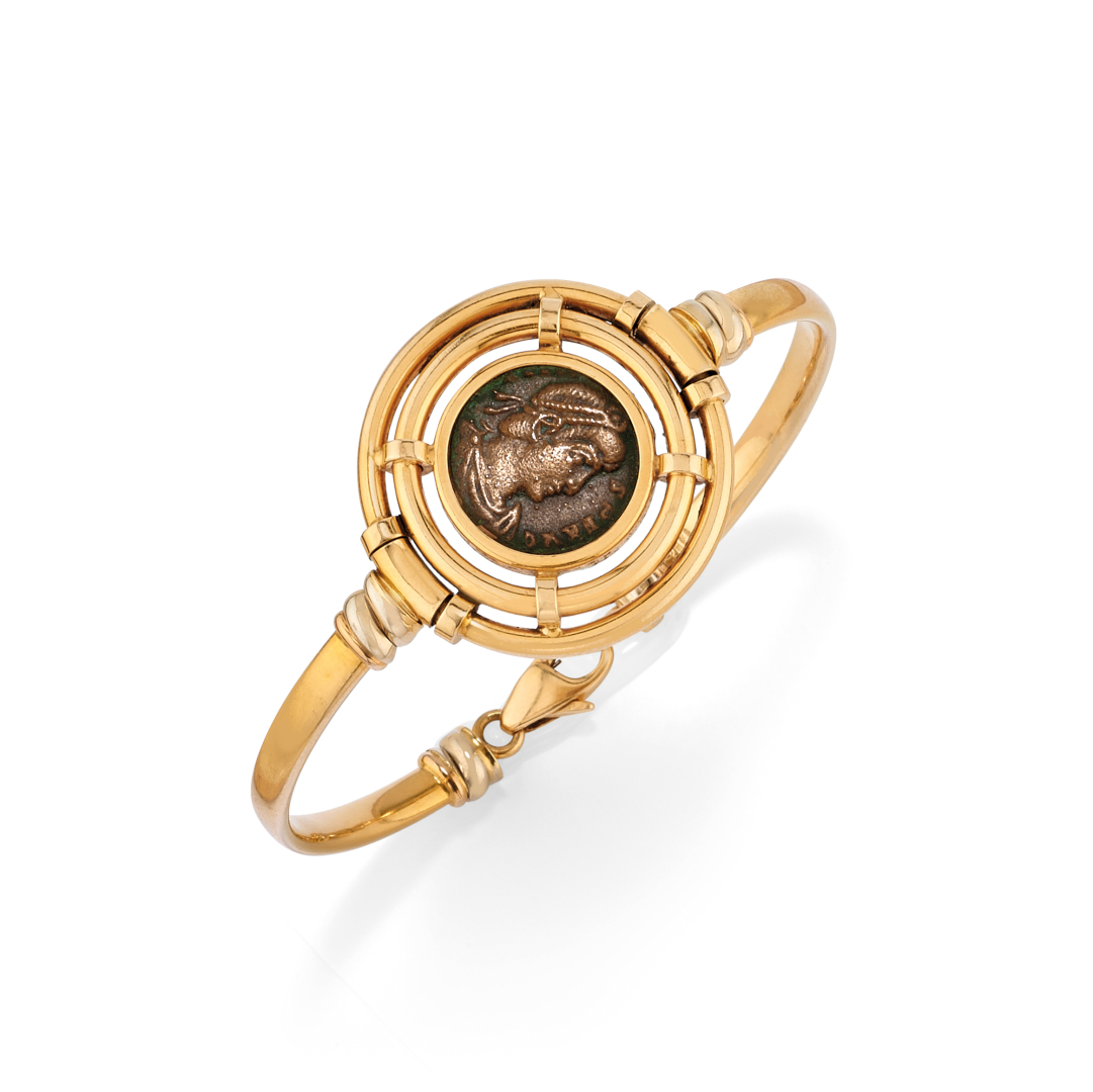 in oro giallo, bianco e rosa con al centro una moneta antica Follis di età romana.