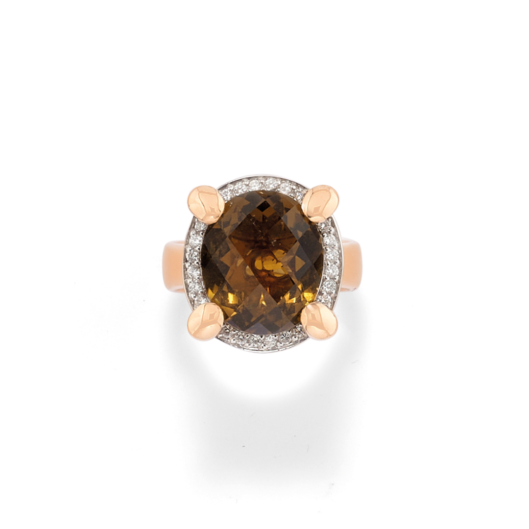 in oro giallo lucido con quarzo citrino taglio ovale sorretto da quattro castoni con contorno di diamanti taglio rotondo.