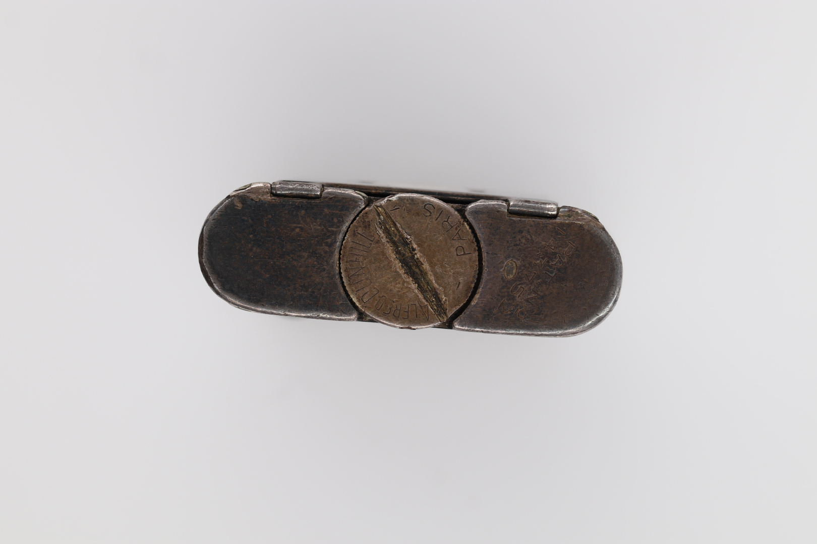 Cassa: in argento sterling e lacca nera, firmata sulla base, n. 4057, apertura a cerniera, fondello a cerniera.