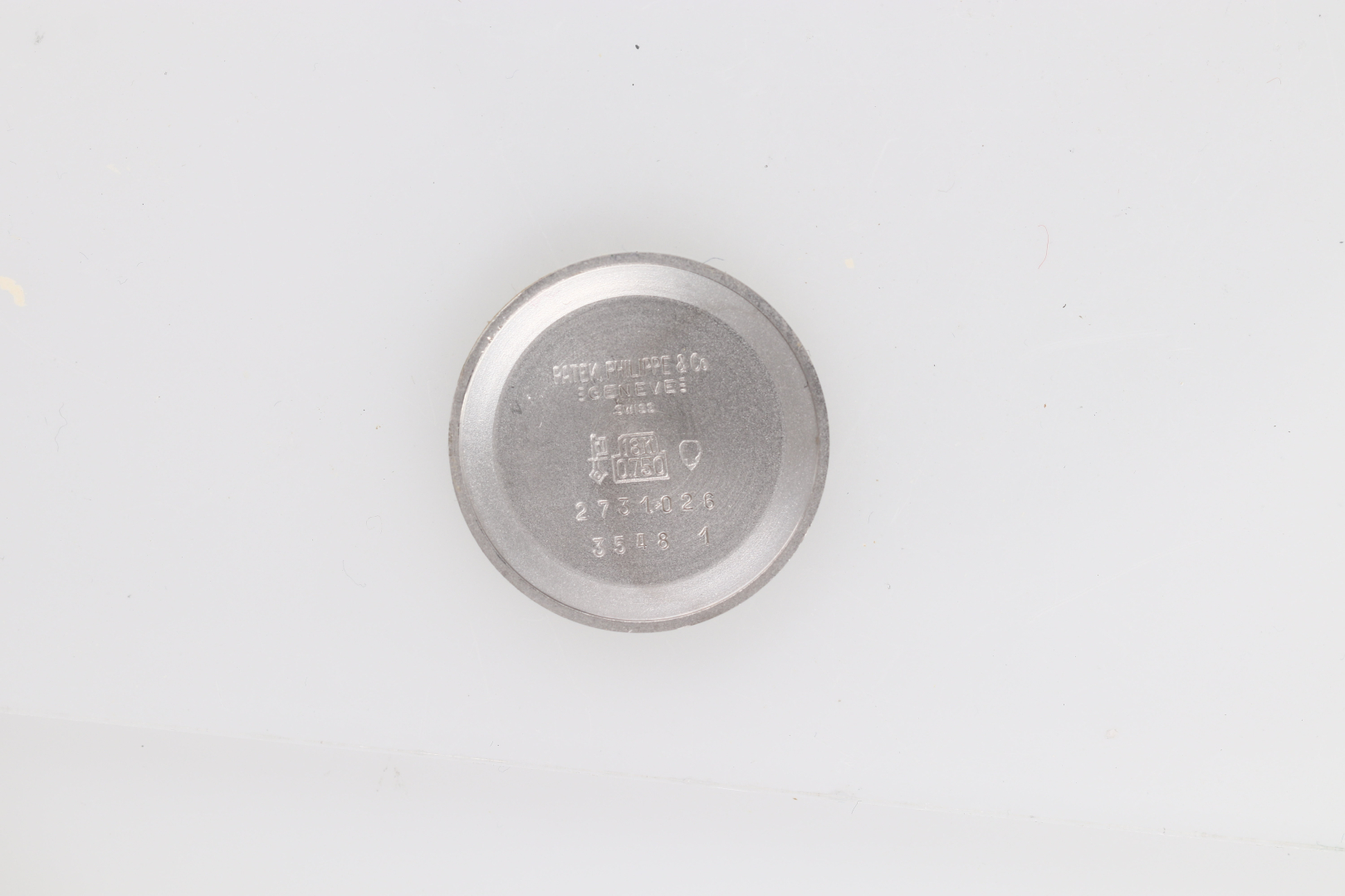Cassa: firmata, n. 2731026, in oro bianco 18K, fondello a scatto, sticker di service Patek. Quadrante: firmato, blu soleil, indici applicati.
