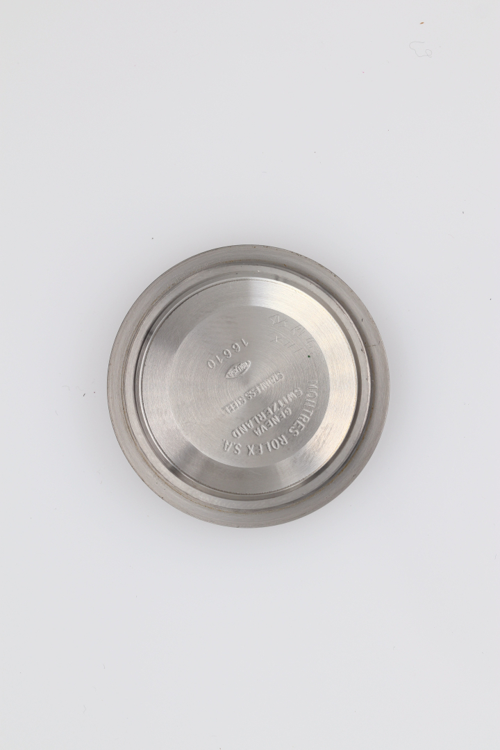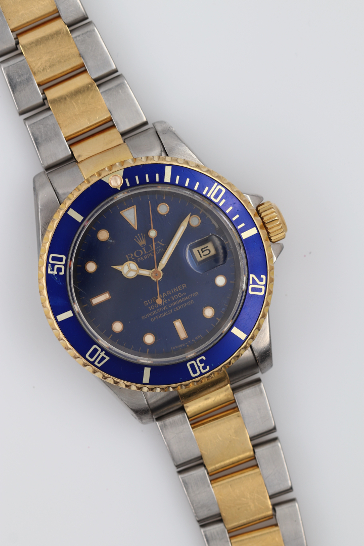 Cassa: firmata, n. W364492, in acciaio, fondello ref. 16610, ghiera in oro con inserto blu graduato.
