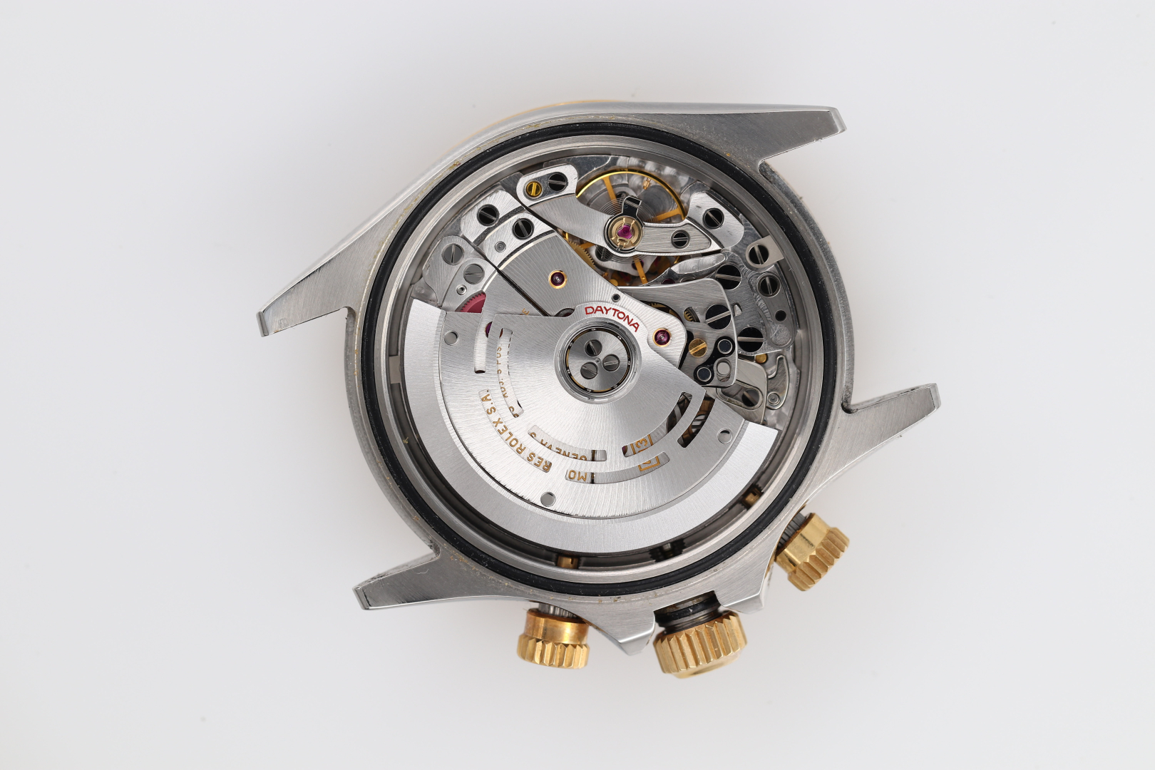 Movimento: firmato, automatico calibro 4130, n. C0008608, 44 rubini, regolato per temperatura e cinque posizioni.